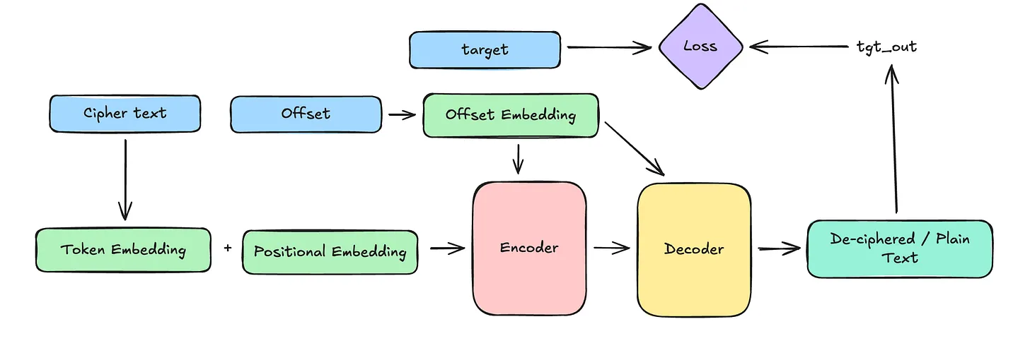 I first wanted to test out the seq2seq apprach, to understand it by-code and not just by building a model but also coming up with my own simple dataset. I had seen numerous examples of the encoder <> decoder stack being used for translation tasks, and it occurred to me that i could try “deciphering” which was a very very similar task and i had a “difficulty knob” with the dataset which would let me start off super simple and then ramp up the complexity.